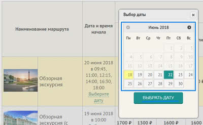Хочу забронировать экскурсию или тур. Как это сделать? Забронировать места на экскурсию или тур вы можете несколькими способами: Самый быстрый способ - отправить онлайн-заявку с помощью сайта. Если вы хотите присоединиться к сборной группе, то отправка заявки на такую экскурсию или тур будет проходить всего в 2 шага. Шаг 1. Перейдите на интересующую вас экскурсию/тур. В блоке с ценами, под описанием нажмите на кнопку "Выберите дату". Появится календарь, в котором вы сможете выбрать подходящую для вас дату и увидеть окончательную стоимость. Нажмите на кнопку "Забронировать" - вы попадете на форму бронирования.