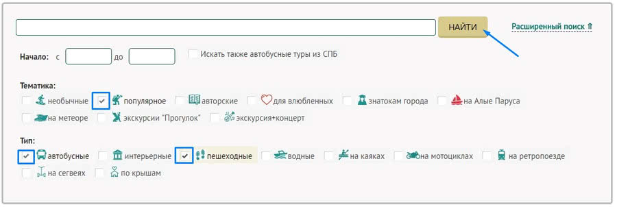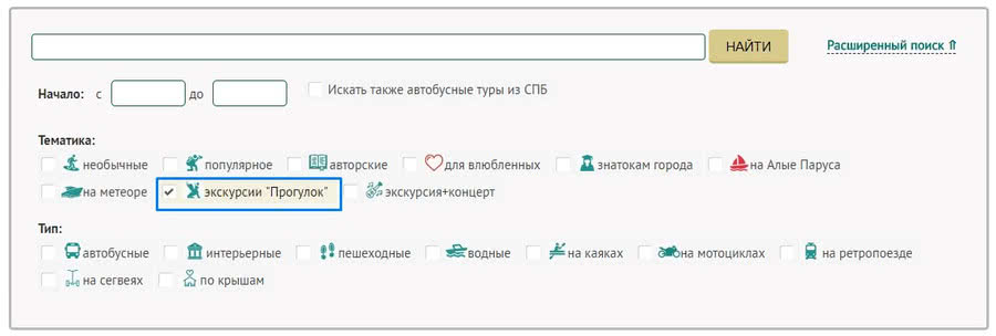 Кликнув на нужную вам экскурсию, вы перейдете на страницу со информацией о датах, стоимости, льготах и возможностью забронировать ее. 2. Использование фильтра по разделу. Если вы хотите посмотреть, какие экскурсии представлены в разделе, предлагаем воспользоваться поиском как фильтром. Отметьте галочками интересующие вас тематики, типы экскурсий, поле для ввода слов оставьте пустым и нажмите кнопку "НАЙТИ". Система подберет для вас экскурсии в соответствии с вашими предпочтениями. Использовать такой фильтр можно абсолютно в любом разделе сайта.