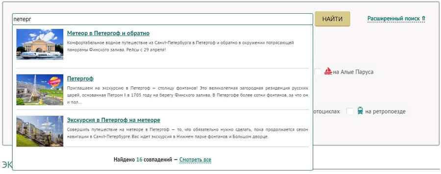 Как найти интересующую меня экскурсию? Мы постарались сделать для вас максимально удобный и дружелюбный функционал поиска экскурсий и туров на нашей сайте. 1. Поиск экскурсий. Если вы знаете точное название экскурсии или основные места (например, город в Ленинградской области), то просто начните вводить нужное слово в строке поиска. Поиск начнет подбирать и выдавать подходящие варианты. Обращаем внимание, что искать экскурсии и туры с помощью поиска необходимо в так называемом "родительском" разделе. Например, не стоит искать "Обзорную экскурсию по Санкт-Петербургу" в разделе "Туры в Карелию", поиск не выдаст результат. Перейдите в раздел "Экскурсии по Санкт-Петербургу" и вводите нужные слова.