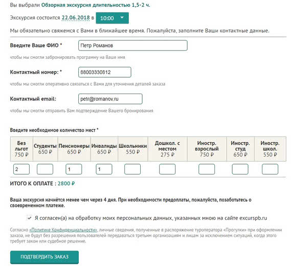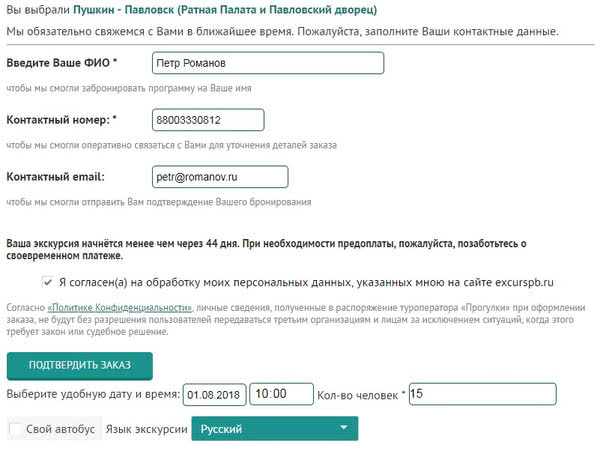 Шаг 2. Заполните форму бронирования. Постарайтесь указать максимально подробную контактную информацию, чтобы мы смогли оперативно обработать вашу заявку. Поля, отмеченные звездочкой * обязательны к заполнению. Не забудьте указать желаемую дату проведения экскурсии, количество человек и язык проведения экскурсии. После того, как все поля будут заполнены - нажимайте на кнопку «Подтвердить заказ» и ждите обратного звонка от специалиста, который обсудит с вами все детали.