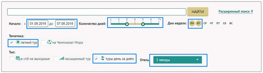 2. Подбор туров с помощью фильтра. Вы можете задать необходимые параметры тура, например, продолжительность, количество звезд в отеле, тематика и отфильтровать все предложения в соответствии с вашими предпочтениями. Выберите галочками необходимые поля, оставьте поле с текстом пустым и нажмите на кнопку «НАЙТИ». Поисковая система предложит вам подходящие варианты туров.