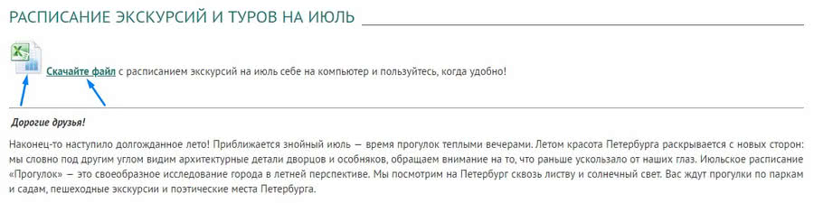 2. Нажмите на одну из последних по дате публикации новостей. Как правило, новость о публикации расписания называется так: «Расписание экскурсий и туров на [название месяца]» 3. В новости вы сможете прочитать анонс всего расписания авторских экскурсий на следующий месяц и скачать файл с расписанием себе на компьютер. Ссылки на файл размещены в начале и конце статьи. Кликните на них, и загрузка расписания произойдет автоматически. Теперь вы сможете открыть его в любое время.