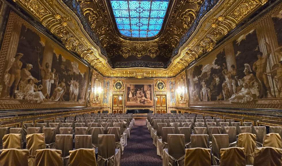 👉 Здесь есть Белый зал, выполненный в стиле Людовика XVI, украшенный натуральным и искусственным мрамором Бронзовый зал, будуар с эркером, облицованная итальянскими резными панелями XVI века библиотека и отделанная кожей и орехом столовая.