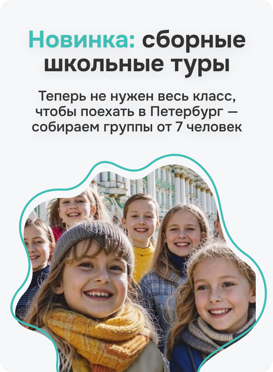 Туры для школьников в Санкт-Петербург — это прекрасная возможность для ребят провести врем увлекательно и с пользой. У нас вы найдете большое количество различных тематических туров, среди которых будет тот самый, идеальный вариант. Наши туры рассчитаны как на учеников начальной школы, так и на более старшие классы.