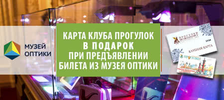 Обменяйте билет из Музея Оптики на клубную карту «Прогулок»! Предъявите билет с датой не ранее мая 2018 года в офисе нашей компании и получите карту
