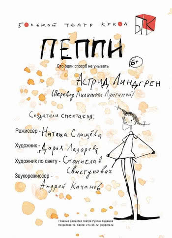 1 июля 2017 г. в Большом театре кукол состоится премьера спектакля «Пеппи» по произведению Астрид Линдгрен (перевод Лилианы Лунгиной), 6+.