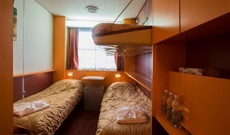 Во всех каютах: шкаф для одежды, радио, кондиционер, холодильник, телевизор, фен, душ, сейф, санузел, обзорное окно (или иллюминатор), розетка 220 V, бутилированная вода с ежедневным пополнением, гигиенический набор.
