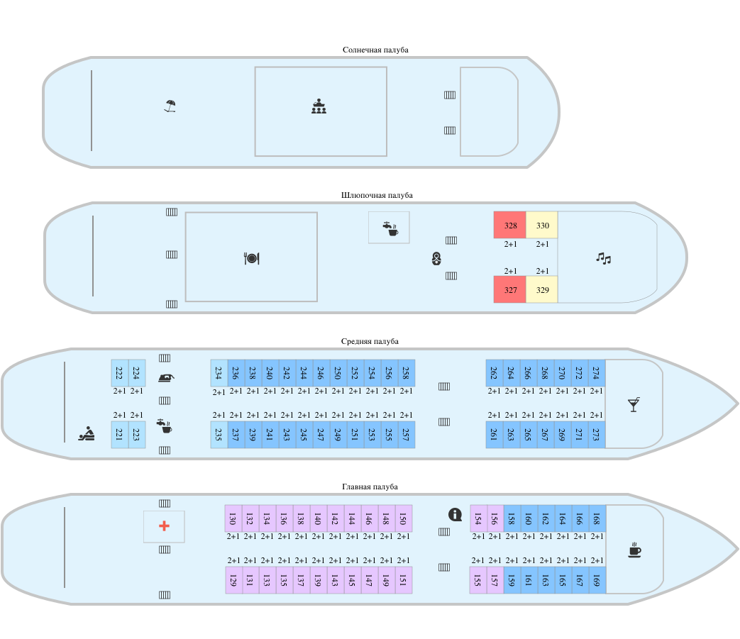РАЗМЕЩЕНИЕДля комфортного размещения гостям предлагаются двухместные и трехместные каюты различных категорий: 2 каюты «Люкс»; 2 каюты «Полулюкс»; 46 двухместных одноярусных кают; 6 двухместных двухъярусных кают и 23 трехместных двухъярусных кают.