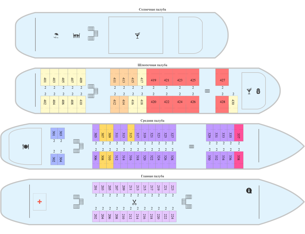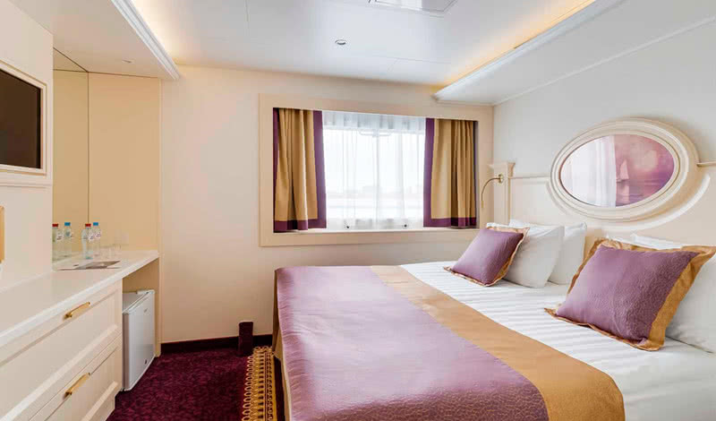 Во всех каютах: кондиционер, холодильник, телевизор, сейф, внутренний телефон, фен, стеклянные стаканы, щетка для одежды, тапочки, бутилированная вода с ежедневным пополнением, гигиенический набор.