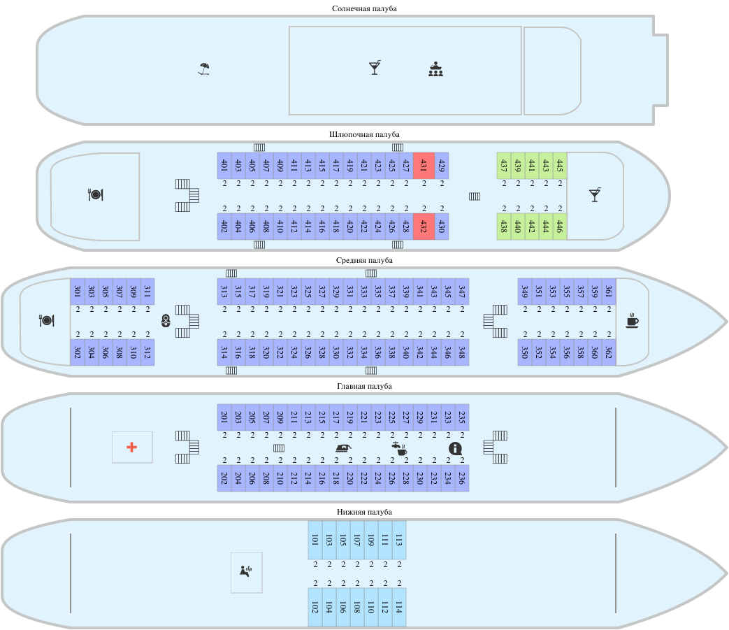 РАЗМЕЩЕНИЕДля комфортного размещения (от 1 до 4 человек) гостям предлагаются каюты различных категорий: 2 каюты «Люкс»; 128 двухместные одноярусные каюты; 14 четырехместных двухъярусных кают и 10 одноместных кают.