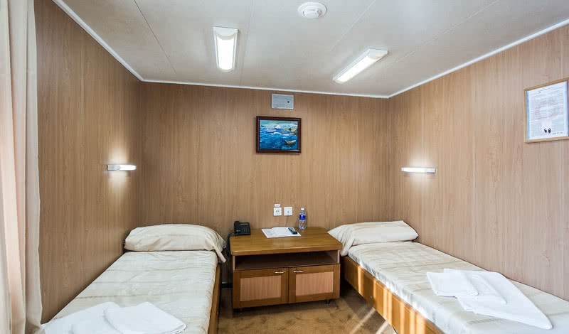 В каюте: две раздельные одноместные кровати (параллельно вдоль стены), прикроватная тумба, телевизор со встроенным DVD, шкаф для одежды, ванная комната (раковина, душ, туалет) в одной зоне, фен, розетки 220V, прикроватные светильники, телефон (звонки по теплоходу), обогреватель, обзорное окно (не открывается).