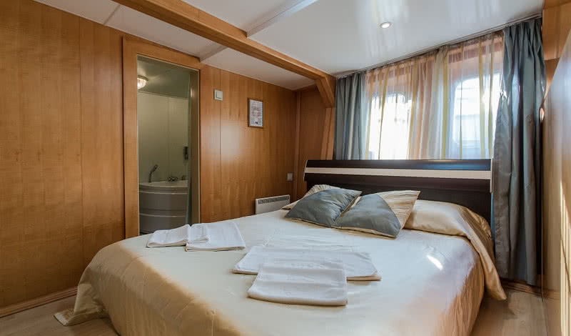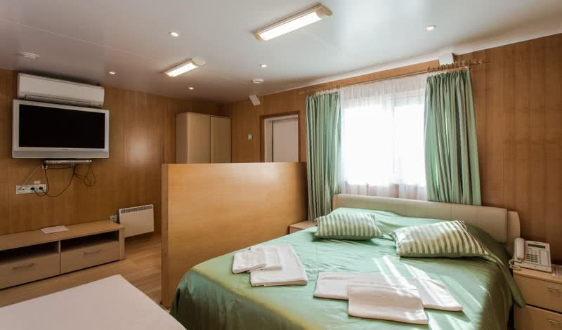 В каюте: одна двуспальная кровать, две прикроватные тумбы, телевизор со встроенным DVD, шкаф для одежды, ванная комната (раковина, душ, туалет) в одной зоне, фен, розетки 220V, прикроватные светильники, телефон (звонки по теплоходу), обогреватель, обзорное окно.
