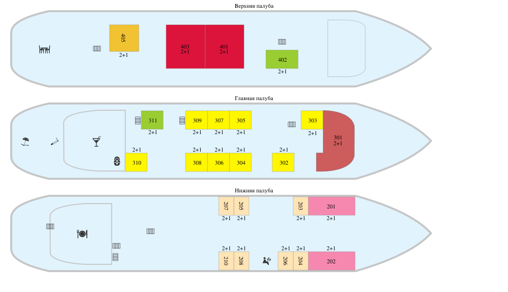 К категории 2-местная (нижняя палуба) относятся каюты: 203–208, 210.