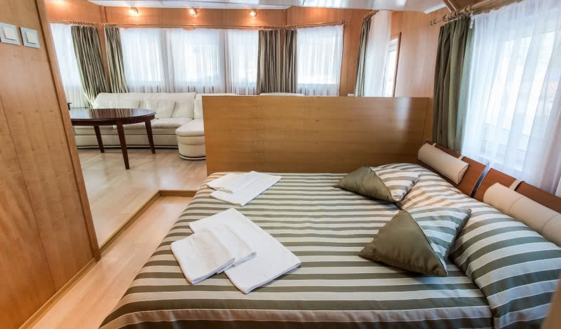 В каюте: двуспальная кровать, прикроватные тумбочки, прикроватные светильники, шкаф для одежды, угловой диван, два кресла, большой круглый стол, стулья, тумба под ТВ, телевизор, журнальный столик, DVD, ванная комната (джакузи, раковина, туалет), фен, розетки 220V телефон (звонки по теплоходу), обогреватель, кондиционер, мини-бар, обзорные окна.