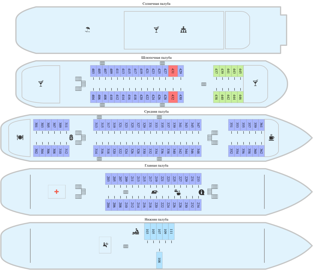 Во всех каютах: шкаф для одежды, радио, кондиционер, душ, санузел, обзорное окно (в каютах нижней палубы – иллюминатор), розетка 220V.