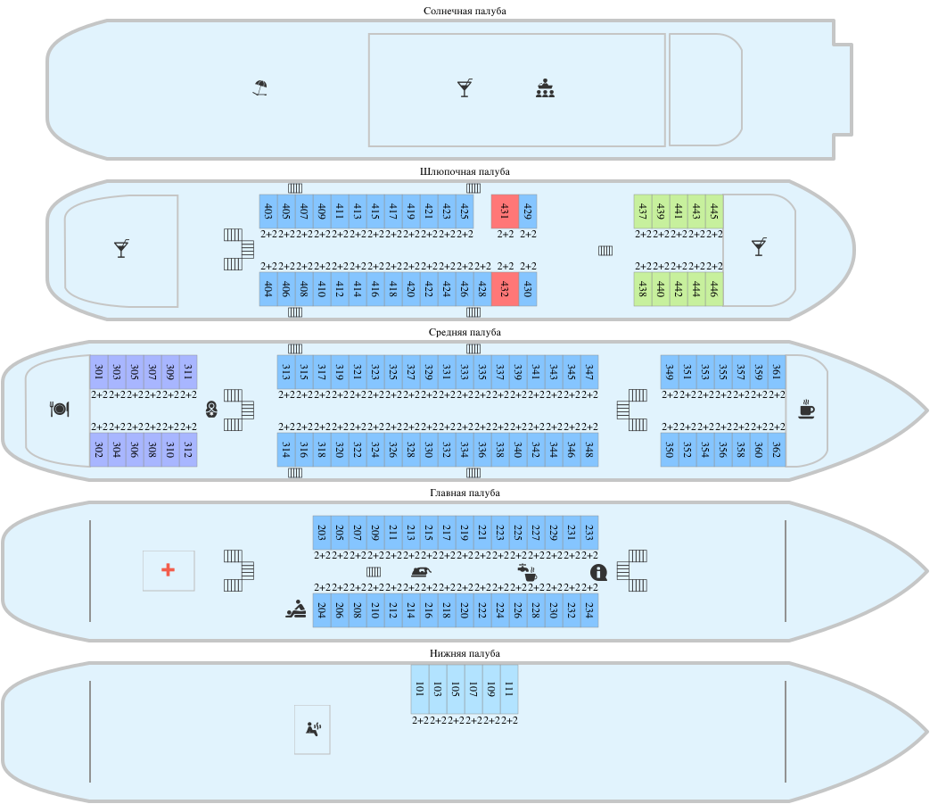 РАЗМЕЩЕНИЕДля комфортного размещения (от 1 до 4 человек) гостям предлагаются каюты различных категорий: 2 каюты «Люкс»; 121 двухместная одноярусная каюта; 6 четырехместных двухъярусных кают и 10 одноместных кают.