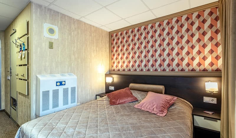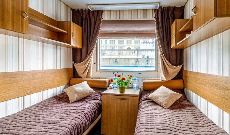 РАЗМЕЩЕНИЕГостям предлагаются: 44 просторные каюты категории «Полулюкс» (20 из них с индивидуальным балконом); 58 двухместных кают «Комфорт» с обновленным дизайном, мебелью и отделкой; 13 одноместных кают «Комфорт» с обновленным интерьером, в том числе одна каюта с балконом; 8 трехместных одноярусных кают на нижней палубе. Именные каюты с балконом названы в честь выдающихся авторов мировой литературы: «Уильям Шекспир», «Федор Достоевский», «Эрих-Мария Ремарк», «Антон Чехов» и других. В каждой каюте теплохода есть кондиционер, холодильник или мини-бар, ТВ и Wi-Fi, в ванных комнатах – выделенная зона для душевой, в «Полулюксах» – душевая кабина.