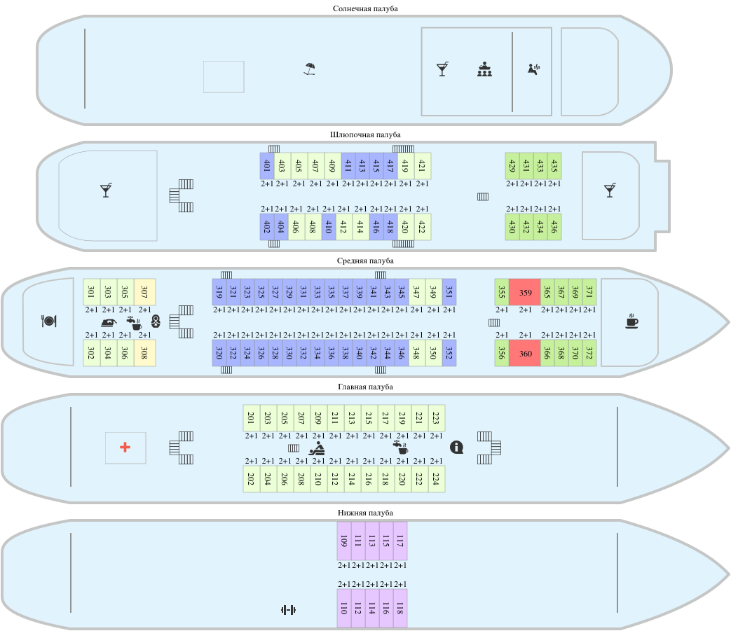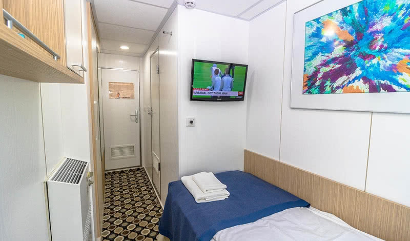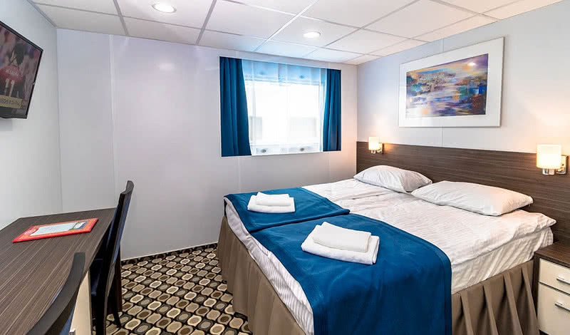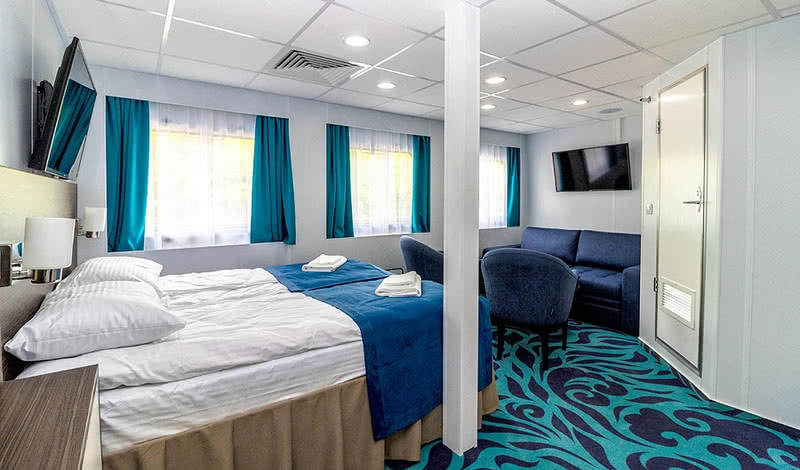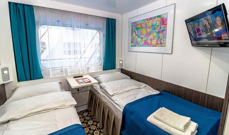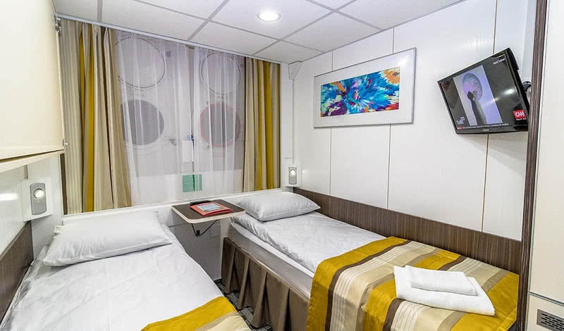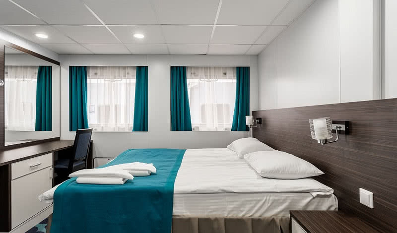 Во всех каютах: шкаф для одежды, радио, кондиционер, холодильник, телевизор, фен, душ, сейф, санузел, обзорное окно (или иллюминатор), розетка 220 V, бутилированная вода с ежедневным пополнением, гигиенический набор.