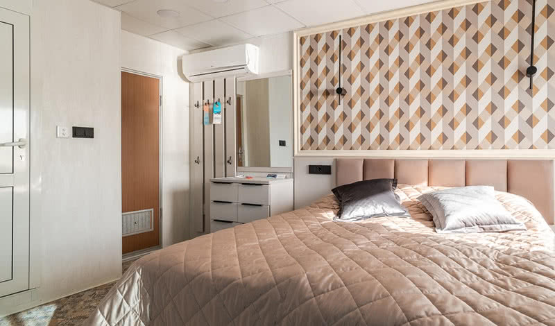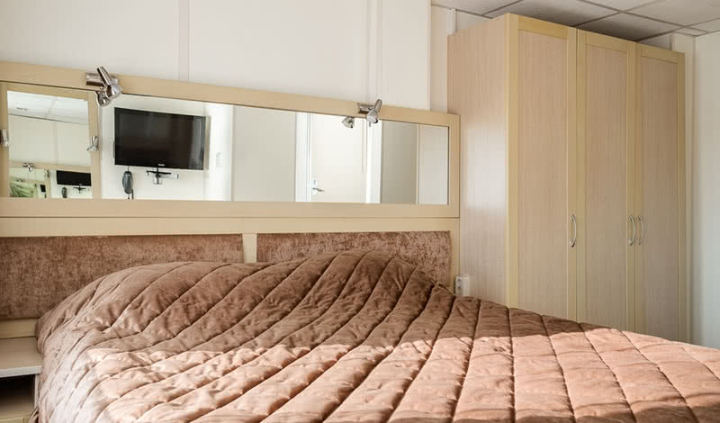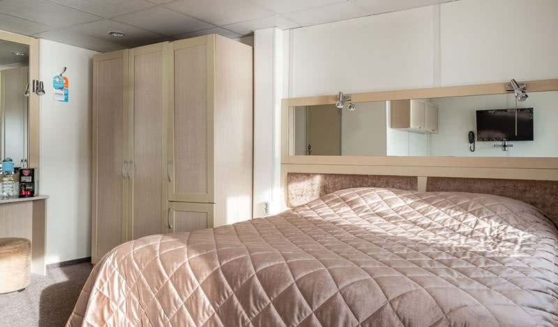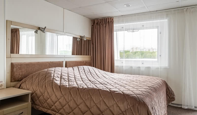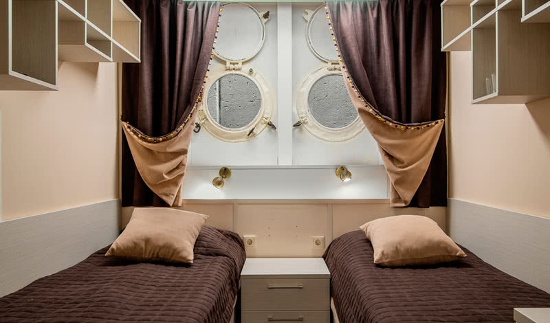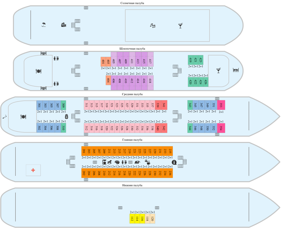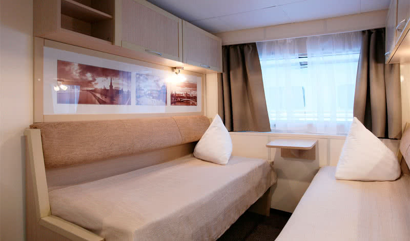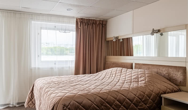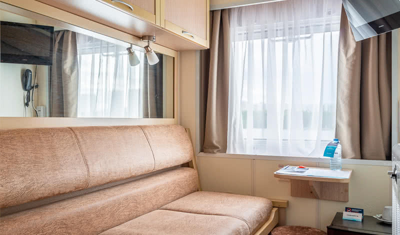 РАЗМЕЩЕНИЕГостям предлагаются: 34 просторные каюты категории «Полулюкс» (14 из них с индивидуальным балконом); 68 двухместных и 11 одноместных кают «Комфорт» с современным дизайном, мебелью и отделкой; 2 двухместные и 4 трехместные одноярусные каюты на нижней палубе. В каждой каюте теплохода есть кондиционер, холодильник (или мини-бар в каютах категории «Полулюкс»), ТВ и бесплатный Wi-Fi.