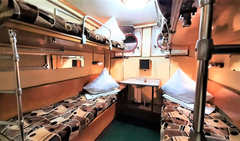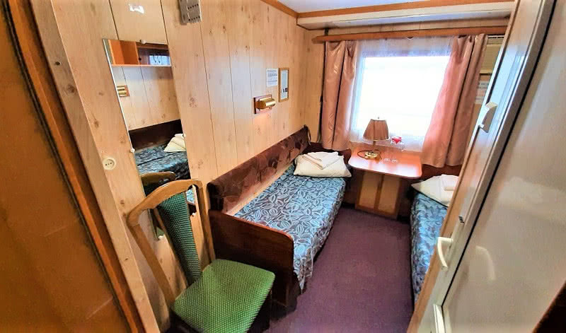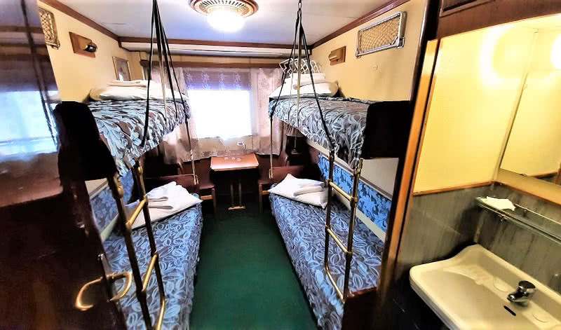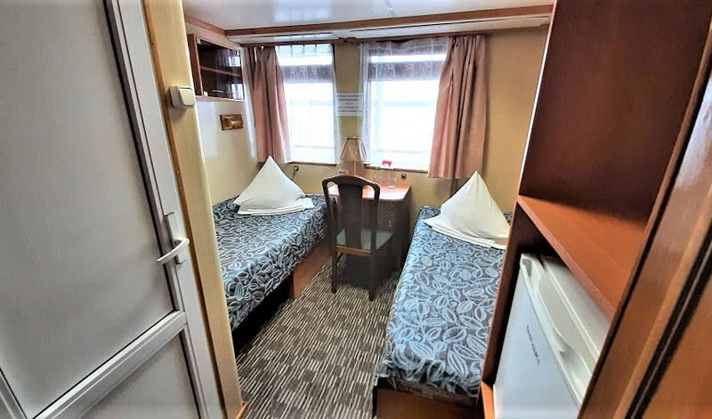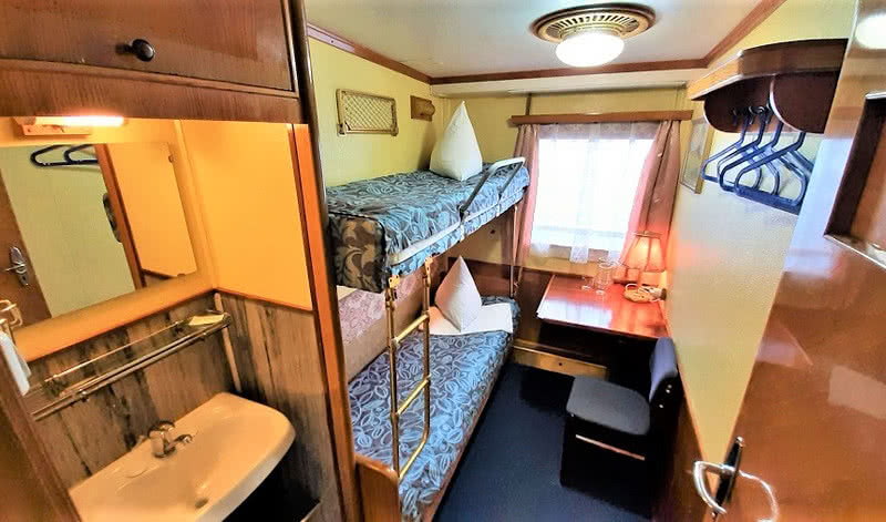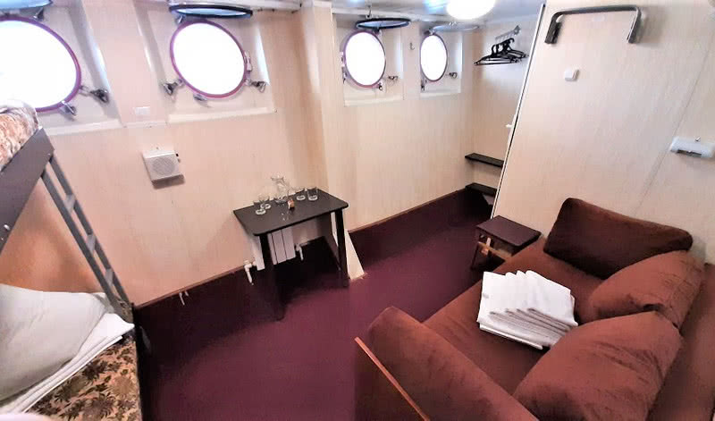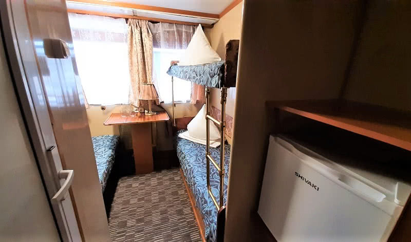 В каюте: два спальных места (нижнего и верхнего расположения), настенная вешалка для одежды, радио, розетка 220V, раковина с горячей и холодной водой, окно.