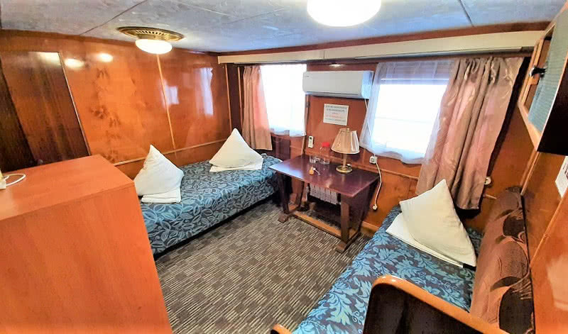 В каюте: два спальных места, столик, кондиционер, шкаф, радио, розетка 220V, ванная комната (раковина, душ, туалет), окно.