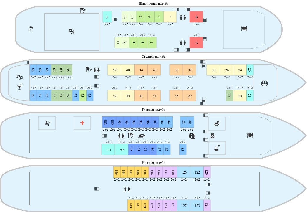 Двухместная каюта со всеми удобствами, расположенная на главной, средней и шлюпочной палубах.
