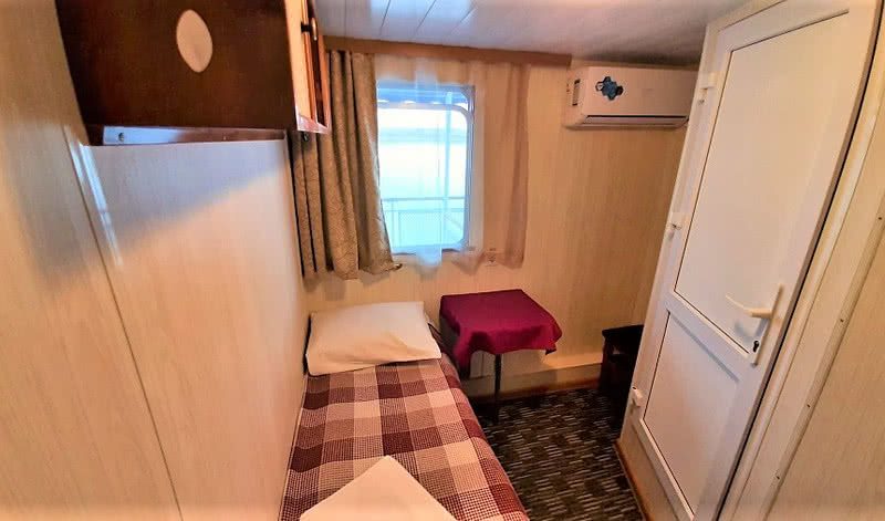 В каюте: односпальная кровать, столик, кондиционер, шкаф, радио, розетка 220V, ванная комната (раковина, душ, туалет), окно.