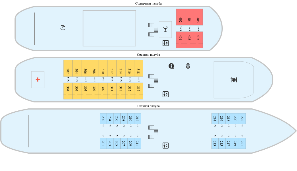 К категории Люкс относятся каюты: 401–406.