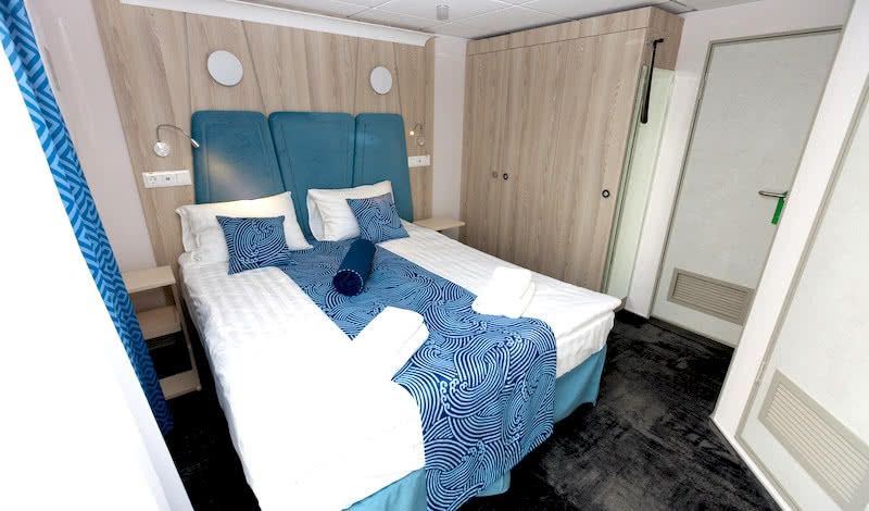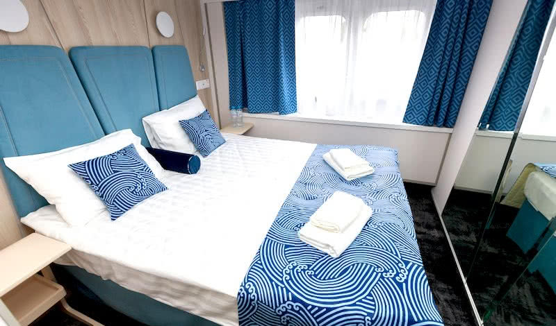 В каюте: двуспальная кровать (можно раздвинуть), ванная комната (раковина, душевая кабина, туалет), кондиционер/обогреватель, телевизор, сейф, внутренний телефон, фен, холодильник, стеклянные стаканы для питья, щетка для одежды, тапочки, туалетные принадлежности, панорамные окна.