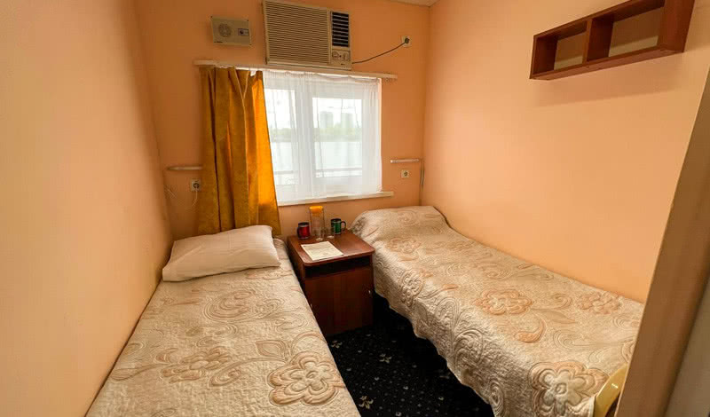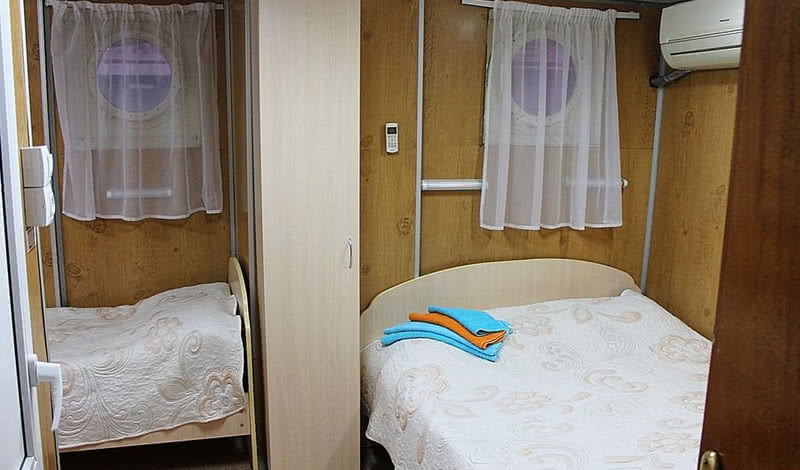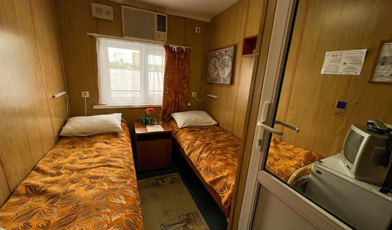 В каюте: две односпальные кровати, раковина с горячей и холодной водой, кондиционер, телевизор, столик, шкаф, обзорное окно.