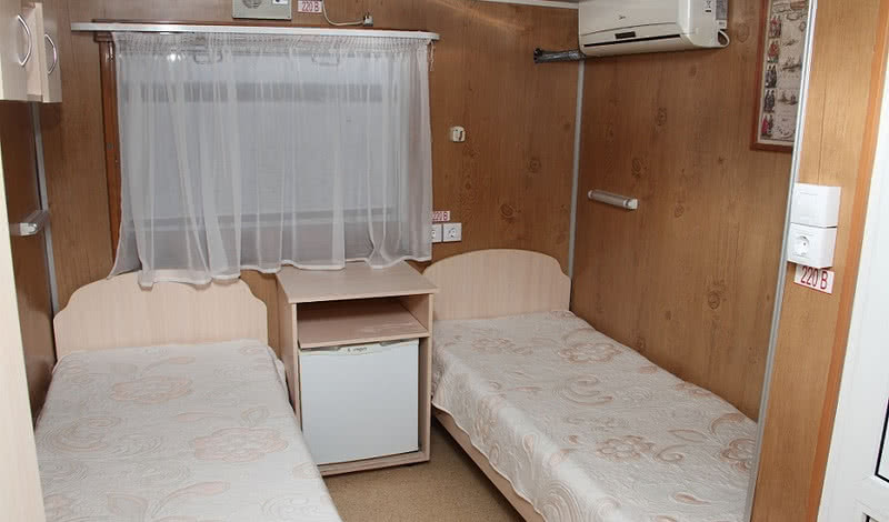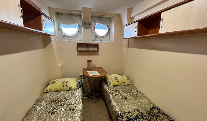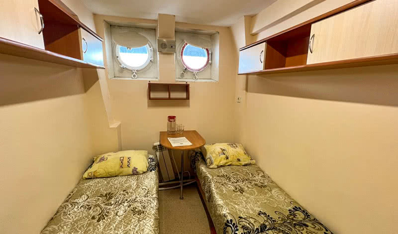В каюте: две односпальные кровати, раковина с горячей и холодной водой, столик, иллюминаторы.
