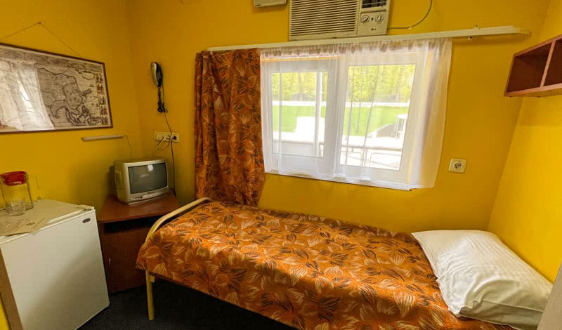 В каюте: односпальная кровать, раковина с горячей и холодной водой, телевизор, мини-холодильник, кондиционер, столик, шкаф, обзорное окно.