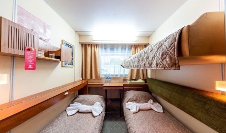 Во всех каютах: шкаф для одежды, радио, кондиционер, душ, санузел, обзорное окно (в каютах нижней палубы – иллюминатор), розетка 220V.