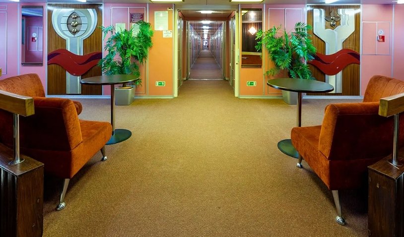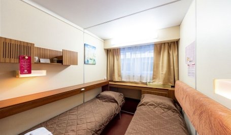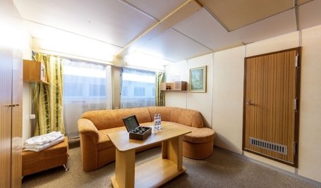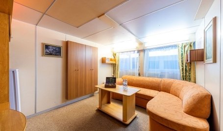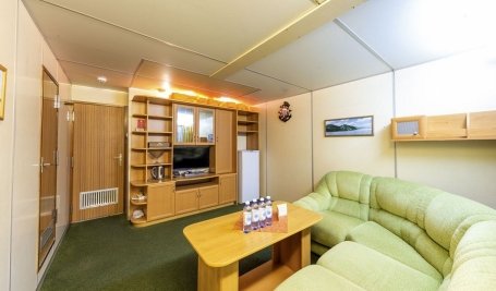 В каютах категорий «Люкс» и «Евролюкс» также есть холодильник, телевизор и фен.