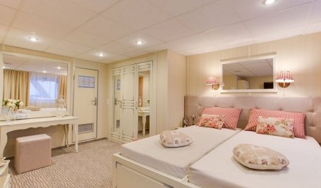В каютах категории «Люкс» возможно бесплатное размещение третьего гостя (ребенка до 14 лет включительно) на дополнительном месте (оплачивается только питание).