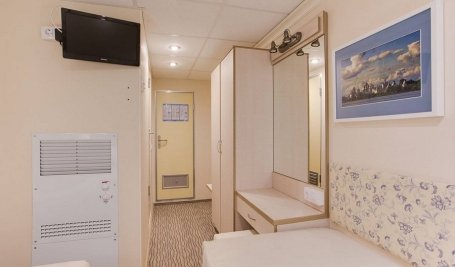 Во всех каютах: кондиционер, холодильник, телевизор, сейф, внутренний телефон, фен, стеклянные стаканы, щетка для одежды, тапочки, бутилированная вода с ежедневным пополнением, гигиенический набор.