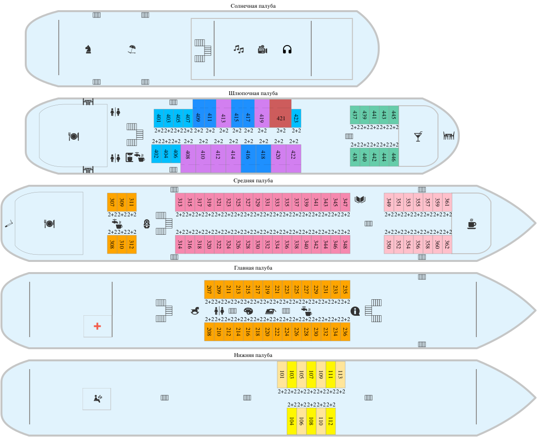 РАЗМЕЩЕНИЕВ каютах теплохода могут с комфортом разместиться до 312 гостей. Вас ждут каюты от стандартных до полулюксов с балконом и даже люкса. Есть как много двухместных кают, так и одноместные, трех- и четырехместные. К навигации-2023 на теплоходе появилось 14 кают категории А2 комфорт.