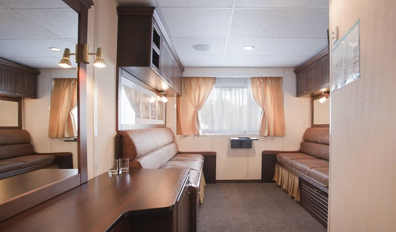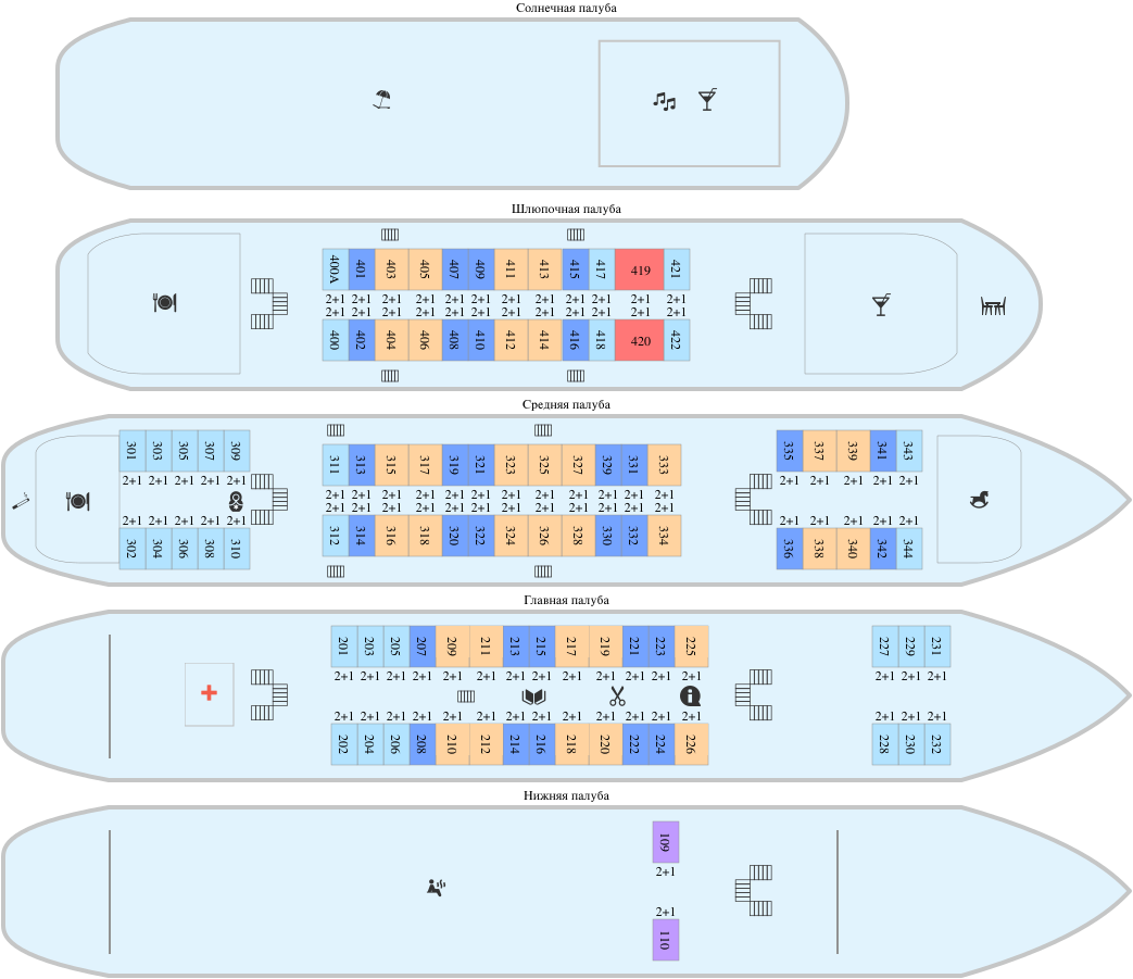 Во всех каютах: кондиционер, холодильник, телевизор, сейф, внутренний телефон, фен, стеклянные стаканы, щетка для одежды, тапочки, бутилированная вода с ежедневным пополнением, гигиенический набор.