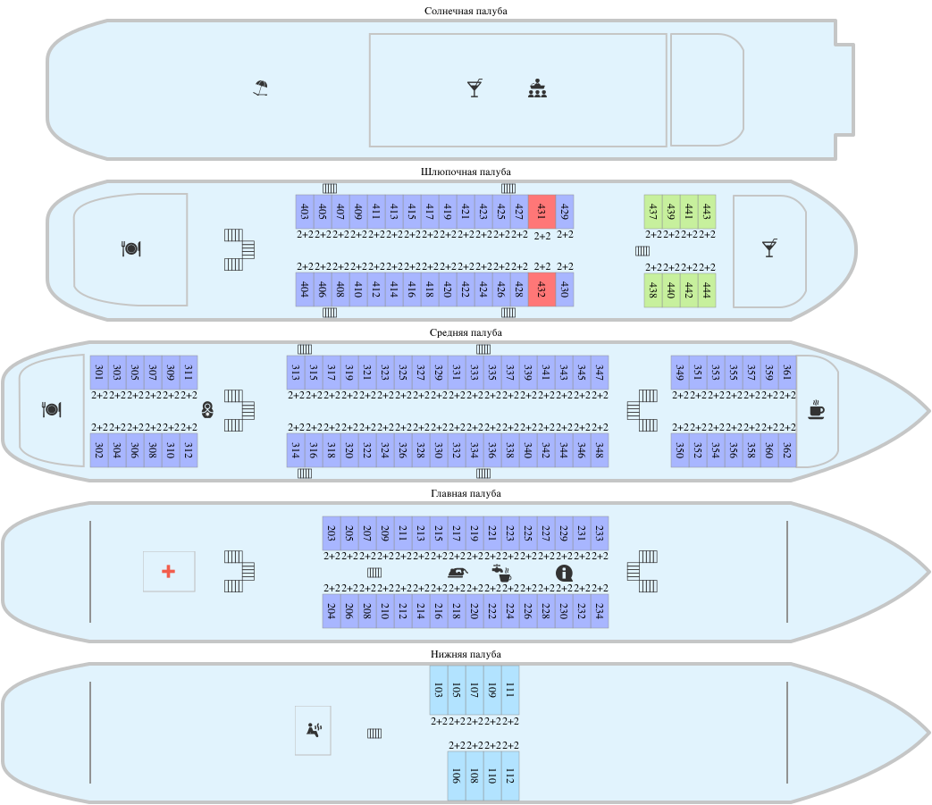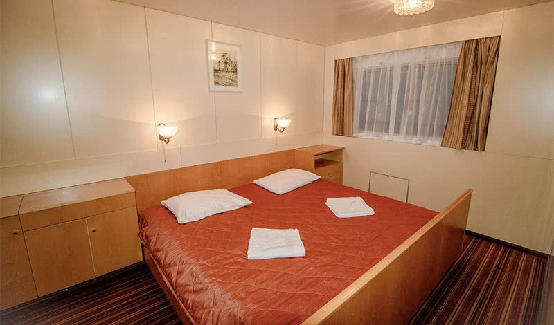 РАЗМЕЩЕНИЕДля комфортного размещения (от 1 до 4 человек) гостям предлагаются каюты различных категорий: 2 каюты «Люкс»; 120 двухместные одноярусные каюты; 6 четырехместных двухъярусных кают и 8 одноместных кают.